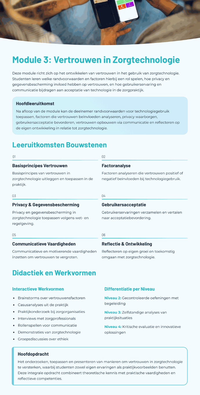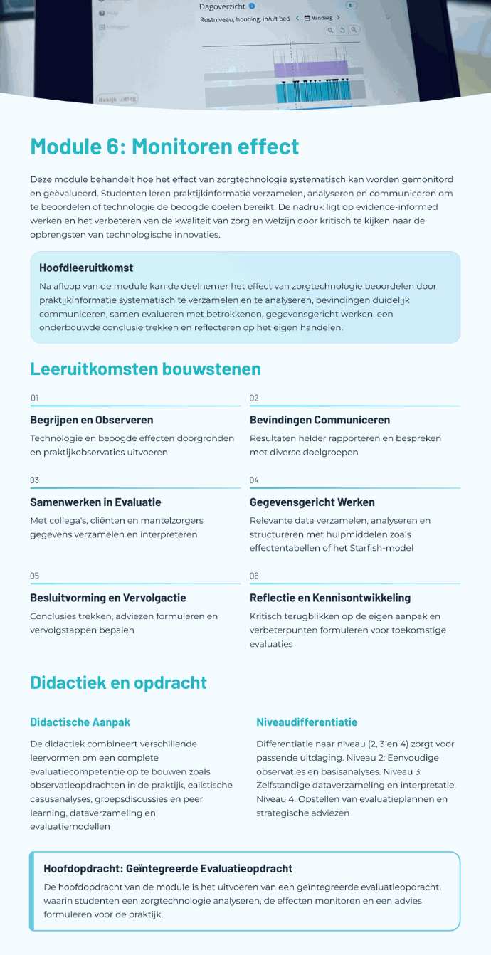 Deze OnderwijsOntwerper helpt docenten, begeleiders of (zorg)professionals bij het ontwikkelen van les- en leermateriaal voor iedere context en op ieder niveau. Deze tool ondersteunt bij het uitwerken van opdrachten, het vormgeven van praktijkgerichte leersituaties en het beantwoorden van inhoudelijke vragen over zorgtechnologie.